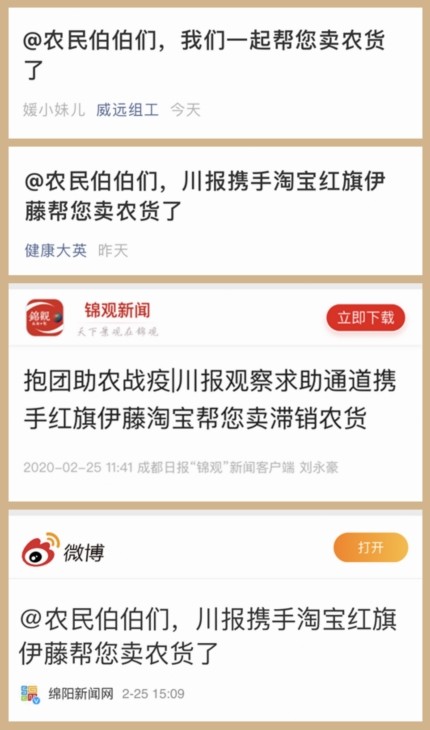 多地市州媒體及縣級(jí)融媒體中心的關(guān)注積極響應(yīng)參與活動(dòng)?!熬W(wǎng)信四川”公眾號(hào)、南充日?qǐng)?bào)“南充見(jiàn)”、成都日?qǐng)?bào)錦觀、眉山在線、開(kāi)江發(fā)布、直播鹽亭、綿陽(yáng)新聞網(wǎng)、宜賓日?qǐng)?bào)、威遠(yuǎn)組工、健康大英等均及時(shí)對(duì)活動(dòng)相關(guān)信息進(jìn)行了發(fā)布,及時(shí)把抱團(tuán)助農(nóng)戰(zhàn)疫活動(dòng)信息帶給當(dāng)?shù)赜行枨蟮霓r(nóng)戶。