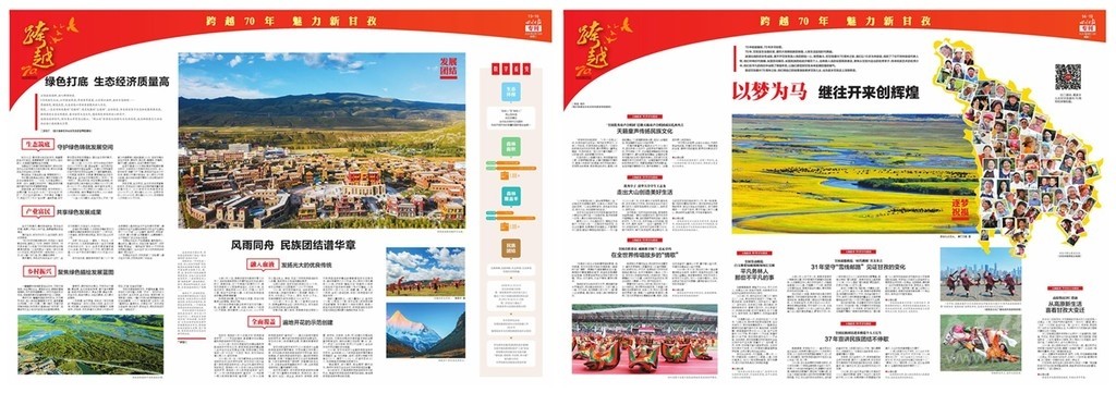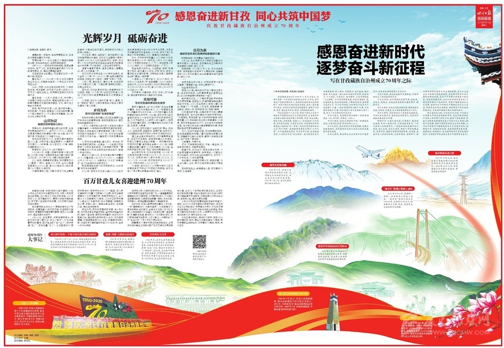 開篇連版以手繪甘孜建州70周年10件大事記鋪底,部分金山、碉樓等民族元素做點綴。版面上有州委州政府的署名文章,還有川報首席記者所寫《光輝歲月 砥礪奮進》70年綜述,并鏈接二維碼,可通過手機掃碼看甘孜70年變遷。