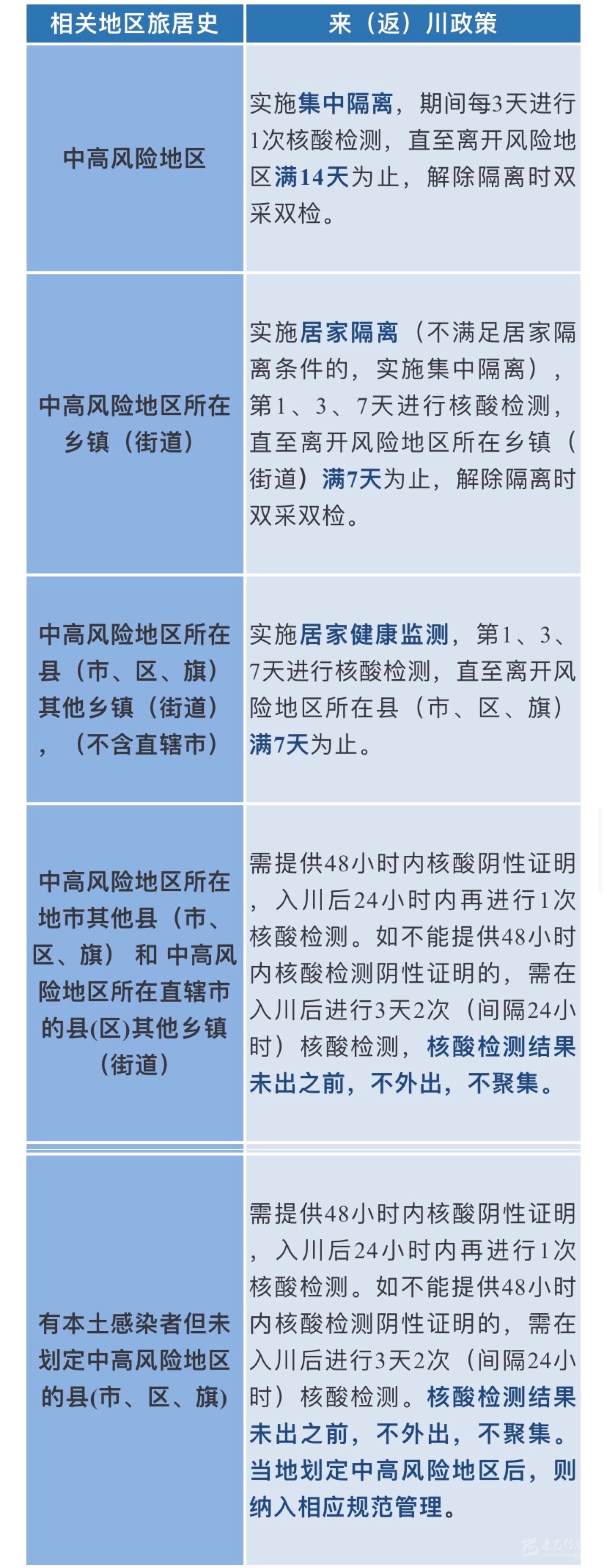 全省中小學(xué)校、托幼機(jī)構(gòu)師生員工本人或其共同居住的家人14天內(nèi)有省外旅居史、有與省外返川人員密切接觸史的,返校時(shí)應(yīng)提供48小時(shí)內(nèi)核酸檢測陰性證明;如不能提供48小時(shí)內(nèi)核酸檢測陰性證明的,需在返校后24小時(shí)內(nèi)進(jìn)行1次核酸檢測。
