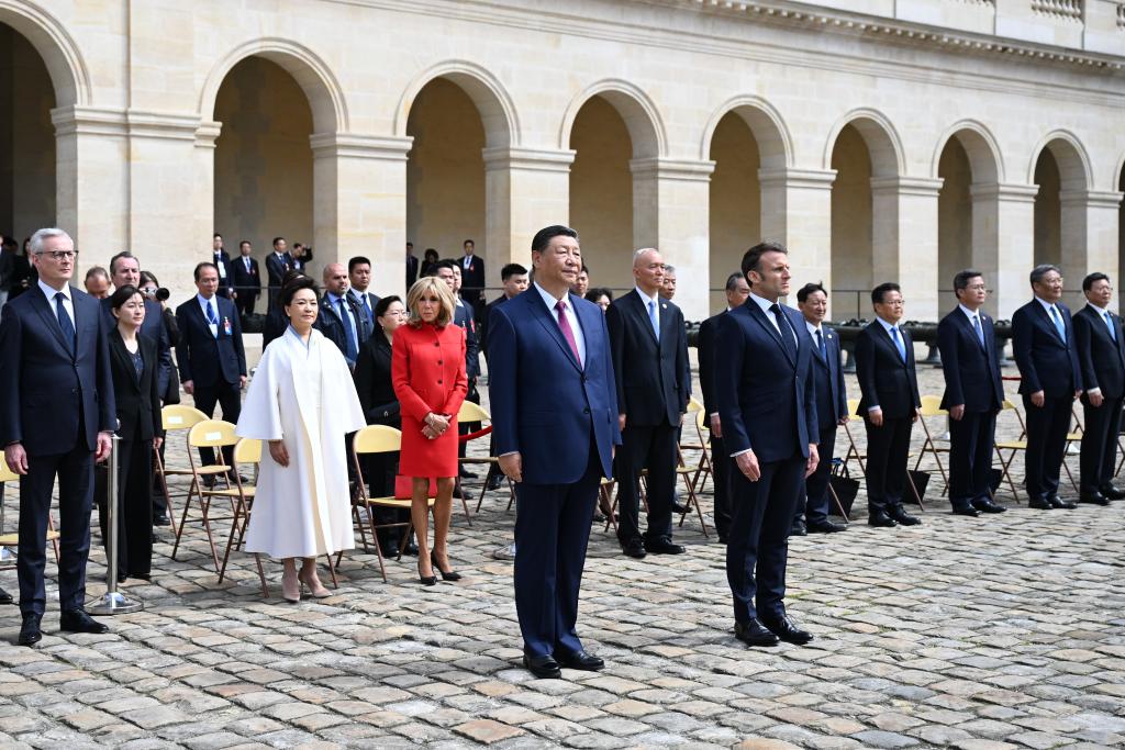 ??當(dāng)天下午,習(xí)近平在巴黎出席馬克龍舉行的隆重盛大歡迎儀式。兩國元首檢閱法蘭西共和國衛(wèi)隊和陸??杖妰x仗隊,并觀看分列式。