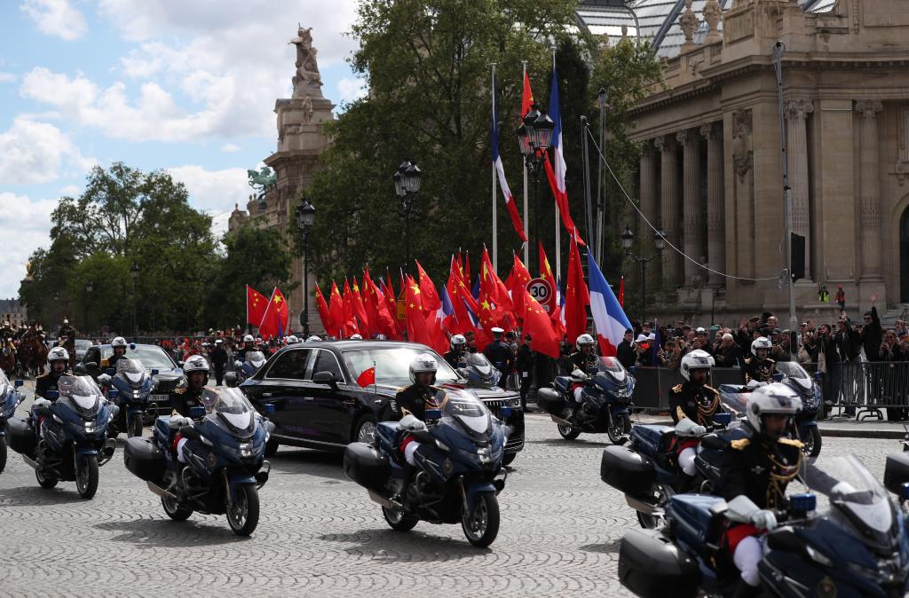 ??歡迎儀式后,習(xí)近平和夫人彭麗媛在共和國衛(wèi)隊148名騎兵組成的禮兵馬隊和摩托車隊護(hù)衛(wèi)下,乘車前往愛麗舍宮。