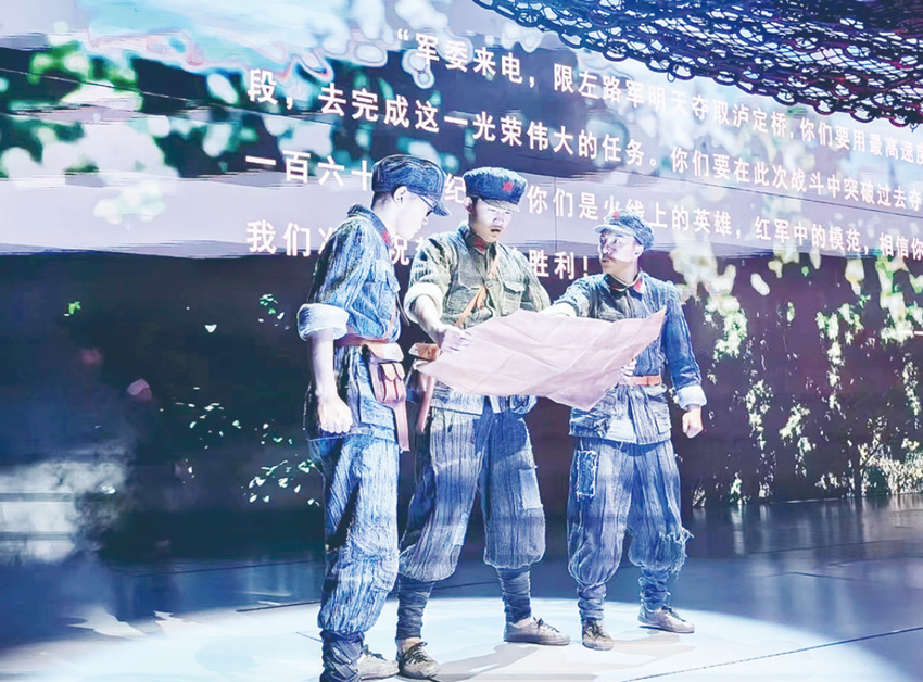“同志們,跟我前進!”“以最快速度趕到瀘定橋,才是我們的首要任務……”舞臺大幕開啟,影像結合舞美形成一組巨型浮雕,在燈光的映照下,紅軍戰(zhàn)士堅毅的臉龐漸漸浮現(xiàn),他們佇立在瀘定橋旁,目光如炬。燈滅,炮火聲從遠處傳來……這是大型原創(chuàng)舞臺劇《飛奪瀘定橋》中的場景,每天上午10時30分和下午3時,該劇在瀘定縣紅軍飛奪瀘定橋紀念碑公園內的紅軍劇場上演。偉大的長征是中國共產黨和紅軍譜寫的壯麗史詩,是中華民族偉大復興歷史進程中的巍峨豐碑。舞臺劇《飛奪瀘定橋》聚焦宏大歷史中的典型事件,以紅軍長征途中飛奪瀘定橋戰(zhàn)役為背景,以一個紅軍小號手的視角,生動講述紅四團晝夜奔襲240里,22名突擊隊員在槍林彈雨中踩著13根鐵索成功奪下瀘定橋的故事,藝術展現(xiàn)紅軍的堅定革命信念和必勝信心,讓觀眾在感動中重溫偉大長征精神。