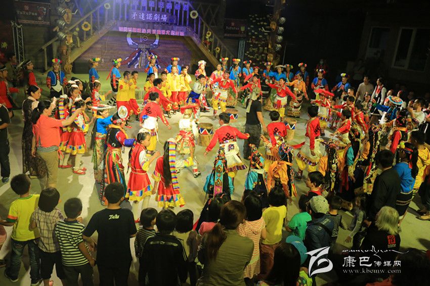 巴塘天籟童聲合唱團與阿里山小學(xué)小朋友、當?shù)厝罕?、外來游客同跳巴塘弦子?br />