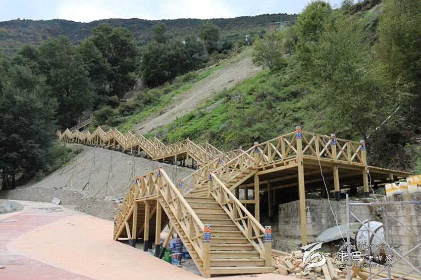 日前記者來到現(xiàn)場,實地體驗了在建中的爐巷·文成路。從甘孜日報社到公主橋,一路上河堤已經(jīng)用漢白玉的石材建起了沿河欄桿,上面雕刻著吉祥八寶圖案。山路中還設計了一個較大的亭子,以這個亭子為中心,上通南無寺,下至將軍橋。一條藏式木制階梯長廊與白土坎村的阿里布果游道相連接,站在長廊的底端向上看階梯長廊,長廊就像一條在山間蜿蜒的巨龍,給爐巷·文成路添上了一抹神秘色彩。