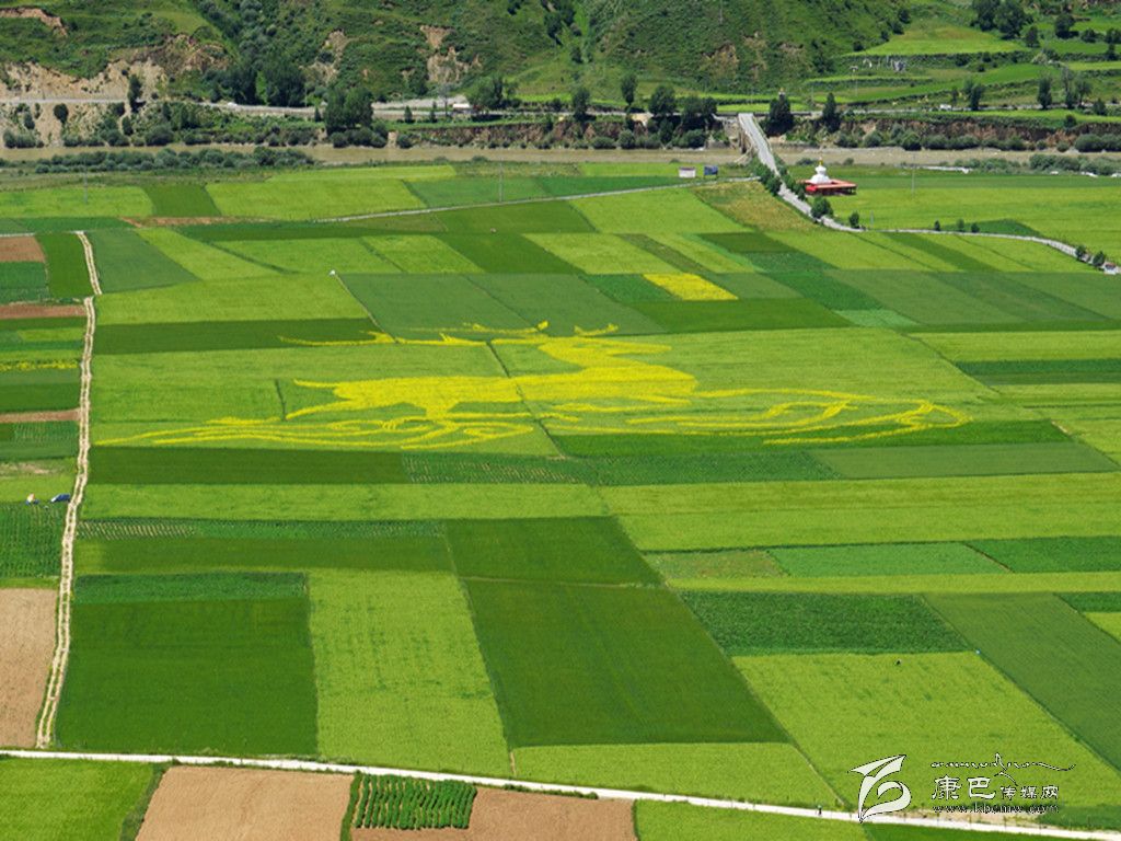 據(jù)了解,為增加游客旅游觀光的看點(diǎn)和蝦拉沱新村建設(shè)的亮點(diǎn),提高蝦拉沱新村乃至爐霍縣的知名度。今年該縣投資29.25萬元在宜木鄉(xiāng)章達(dá)村集中5戶共計(jì)16畝土地作為該縣縣名種植基地,在蝦拉沱村集中13戶共計(jì)72畝土地作為吉祥金鹿圖案種植基地。在州縣技術(shù)人員的共同努力下,經(jīng)過土地選定劃分→土地整理→土壤施肥→青稞播種→放線編圖→開溝覆膜步步細(xì)作,兩個(gè)圖案全部覆膜成型,之后又完成整個(gè)圖案油菜播種作業(yè)。由此建成蝦拉沱村以1500畝青稞連片為背景,用油菜繪制金鹿圖案的創(chuàng)意觀光農(nóng)業(yè)示范區(qū);章達(dá)村以1000畝青稞連片為背景,用油菜繪制“爐霍”兩字圖案的創(chuàng)意觀光農(nóng)業(yè)示范區(qū)。