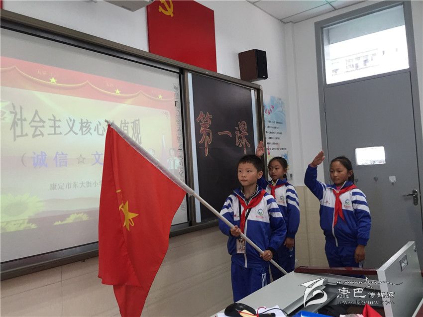 本網(wǎng)訊(胡銀春文/圖)“同學(xué)們,請牢記,我們是光榮的少先隊員,我們時刻以一個少先隊員的標(biāo)準(zhǔn)嚴(yán)格要求自己,遵守學(xué)校紀(jì)律,認(rèn)真學(xué)習(xí),做一個德、智、體、美、勞全面發(fā)展的好學(xué)生。”開學(xué)伊始,康定市東大街小學(xué)將培育和踐行社會主義核心價值觀教育作為“開學(xué)第一課”,引導(dǎo)全校學(xué)生樹立正確的人生觀、價值觀,教育學(xué)生用實際行動踐行社會主義核心價值觀。