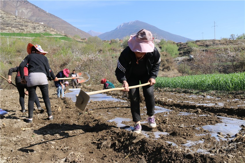 4月15日,記者從巴塘縣城出發(fā),沿國道318線走訪了該縣的5個村莊,沿途看到絕大多數(shù)耕地都鋪上了地膜,記者在該縣黨巴鄉(xiāng)玉卡通村看到正在忙碌播種玉米的村民。而這支春耕隊伍的“帶頭人”正是該村村民大尼瑪,在場的人都是其家人或鄰居。