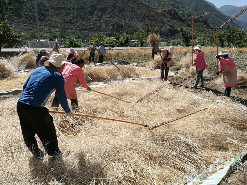 本網訊(尼胡克布 李娟 文/圖)5月12日,在瀘定縣德威鄉(xiāng)下河壩村農田里,村民李永強正組織親戚朋友20余人,對自家3畝多油菜進行搶收。村民們有的負責把一捆捆曬干的油菜抱到油布上,有的負責用農具進行打籽,現場一派繁忙的景象。