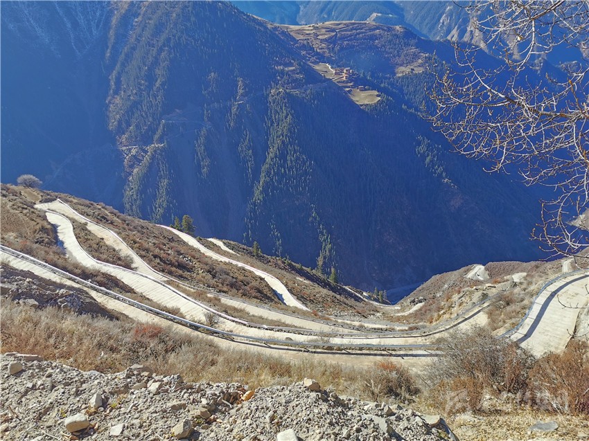然布村山頂,住著包括白馬青珠和嘠絨多吉家在內(nèi)的14戶藏族老鄉(xiāng)。以前,從海拔3000米的山腳,到海拔4000米的山頂家里,只有一條一米左右寬的羊腸小道。下山一個來回,路上就要花一整天。山高路險、交通不便,許多村民一年都難得下山一趟。遇上需要修房運送木材等,靠著人拉馬馱,來來回回,光運輸就要耽擱大半個月時間。