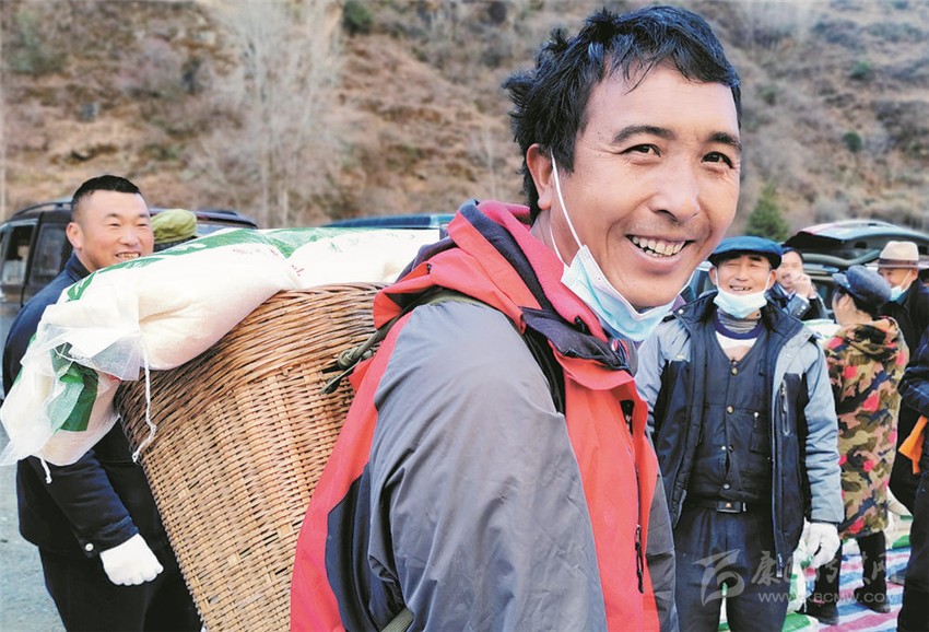 在去往格什扎鎮(zhèn)二道橋村的路上,市民降初將私家車停靠在路旁,拿出相機(jī)拍著眼前的美景,筆者停下車走上前與他交談。降初很健談,他告訴筆者,由于受疫情的影響,今年許多市民選擇在自己家里過年。臘肉、香豬腿、酸菜等是春節(jié)必備的美味佳肴。“買得放心,才吃得放心嘛!”降初打開車子的后備箱,指著里面滿滿的年貨笑著說。