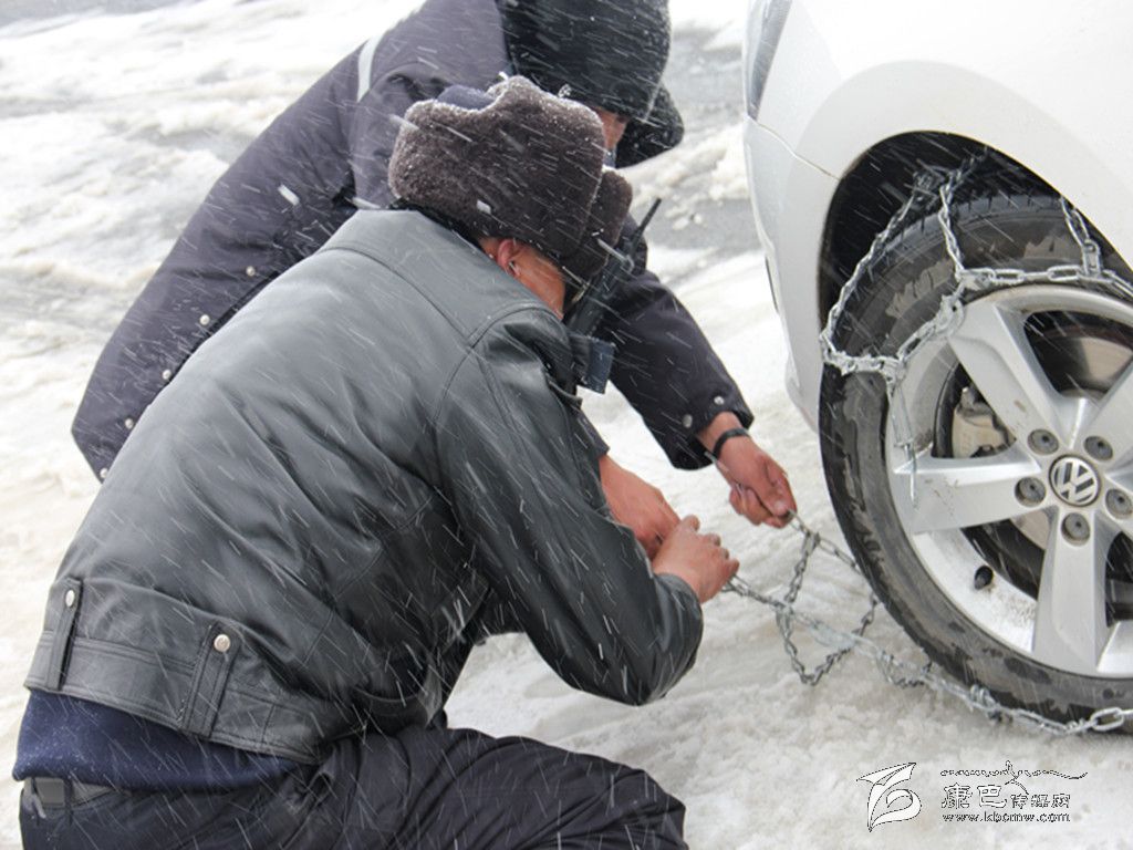 王洛讓在雪地里幫助外地車輛掛鏈條。