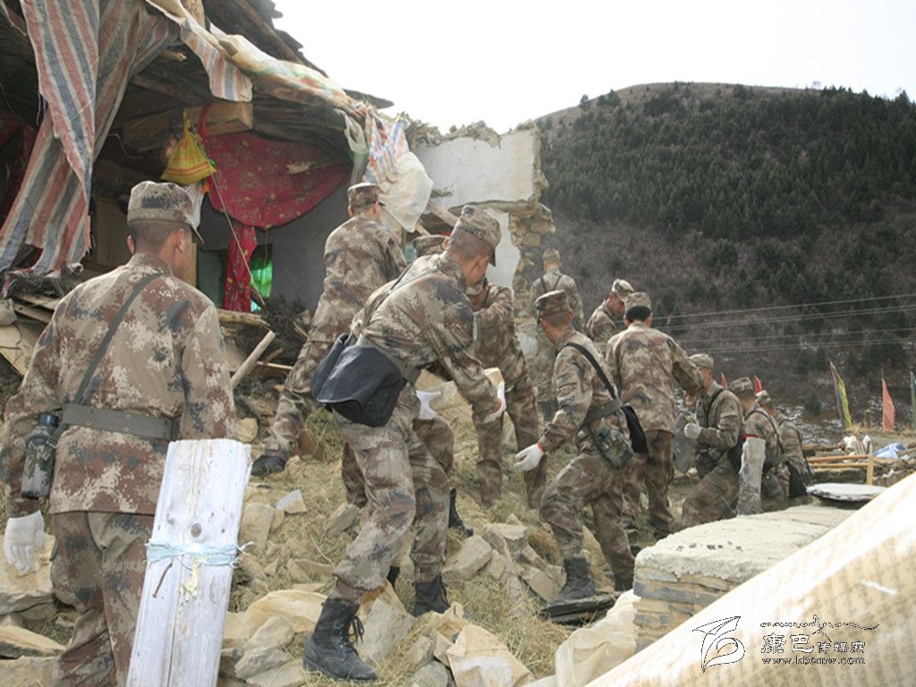甘孜軍分區(qū)官兵為康定地震災區(qū)清理坍塌建筑。
