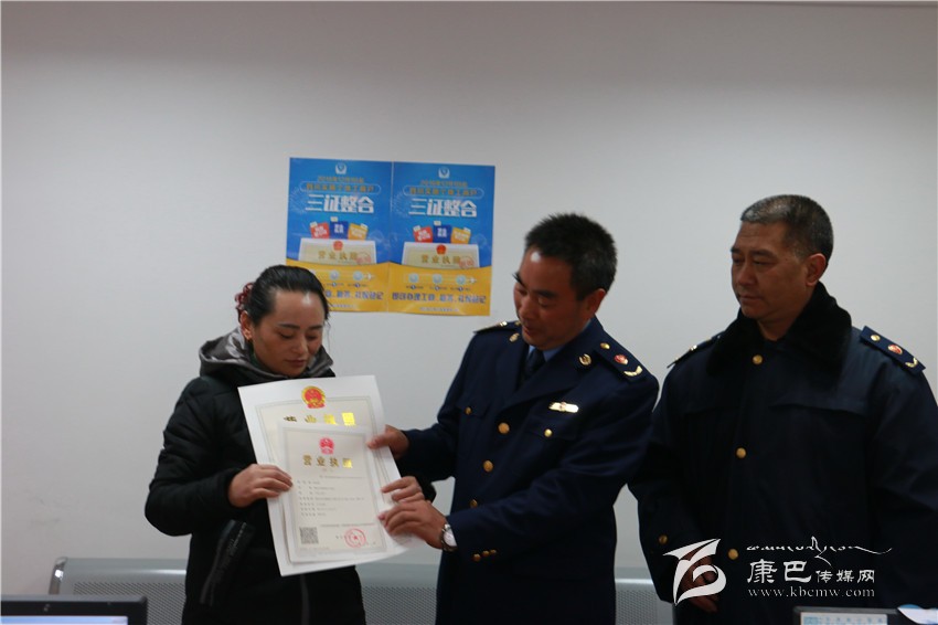 本網(wǎng)訊(迎春 文/圖)12月1日上午,我州首張個(gè)體工商戶“三證整合”營(yíng)業(yè)執(zhí)照在康定市食藥工商局工商所辦證窗口,由州工商局副局長(zhǎng)席小康和康定市食藥工質(zhì)局局長(zhǎng)楊永勝一同,把新版?zhèn)€體工商戶“三證整合”營(yíng)業(yè)執(zhí)照發(fā)放到個(gè)體工商戶張春碧手中。首發(fā)個(gè)體工商戶“三證整合”營(yíng)業(yè)執(zhí)照拉開(kāi)了我州個(gè)體工商戶“三證整合”登記的帷幕。今后,公民只需填寫“一張表”,向“一個(gè)窗口”提交“一套材料”即可辦理個(gè)體工商戶、稅務(wù)登記及社會(huì)保險(xiǎn)登記。截止12月1日12點(diǎn),我州共計(jì)發(fā)放個(gè)體工商戶“三證合整”新版營(yíng)業(yè)執(zhí)照15份。