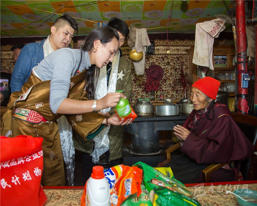 為了及時(shí)將物資送到群眾手中,公益小組一行當(dāng)日凌晨4點(diǎn)便從成都出發(fā),于下午1點(diǎn)到達(dá)走訪地石渠縣。隨后,公益小組不顧舟車勞頓,堅(jiān)持走訪了10戶此次“新牧民養(yǎng)成計(jì)劃”示范家庭,為他們送上了生活禮包及文明禮包,并送上了節(jié)日的祝福。年過七旬的卓嘎是本次“新牧民養(yǎng)成計(jì)劃”示范戶之一,體弱多病的她堅(jiān)持要迎接公益小組的到來,并獻(xiàn)上哈達(dá)。收到物資后她激動(dòng)地說,兩年前華僑城來到石渠縣,為他們帶來了新棉被,那個(gè)冬天他們一點(diǎn)都不冷,現(xiàn)在又送來了糧食和生活用品,讓他們可以過上更好的生活。