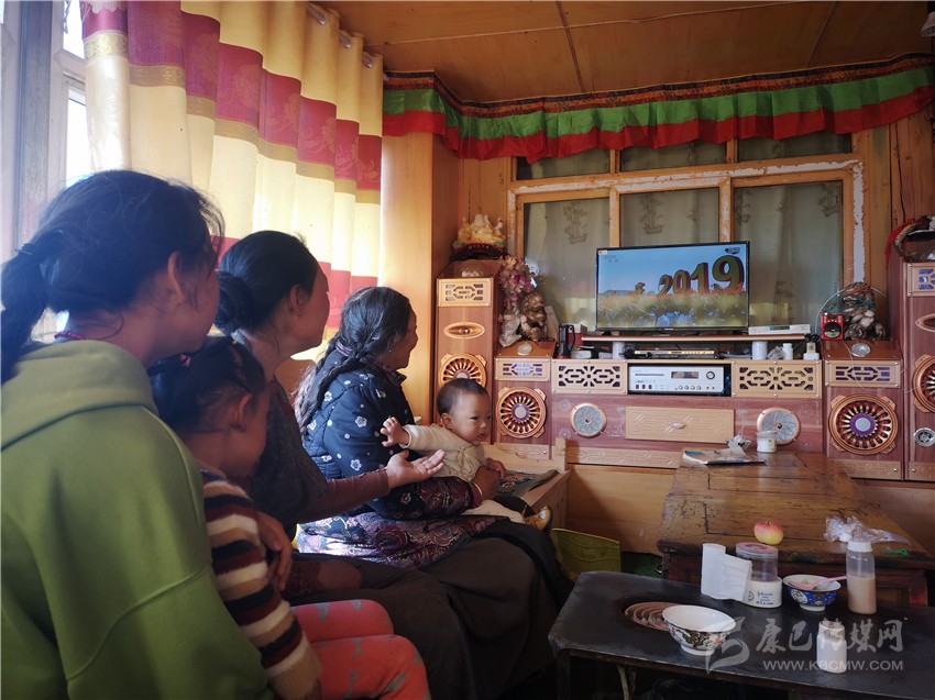 甘孜縣斯俄鄉(xiāng)日安村貧困戶布益洛和家人收看慶祝大會直播。