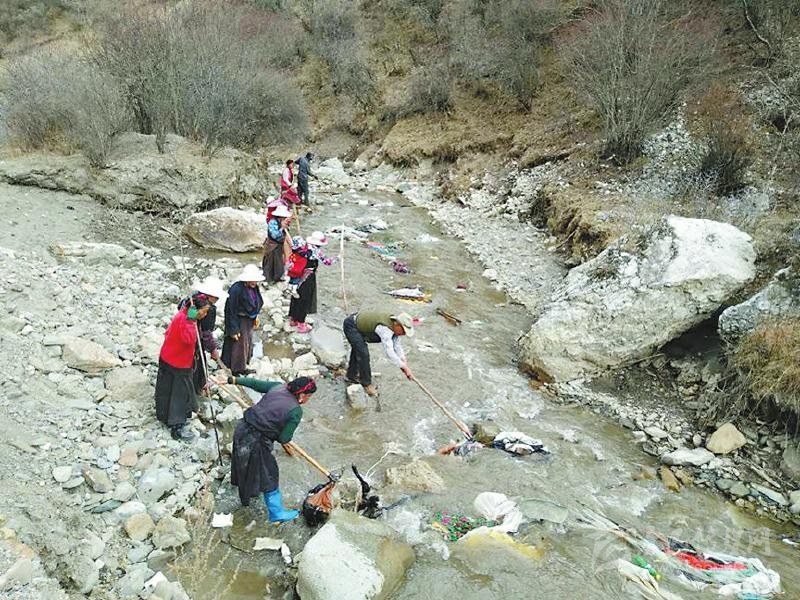 說干就干,黃先明帶領(lǐng)駐村工作隊隊員和村兩委班子成員不畏嚴寒,首先把全村的道路、公共設(shè)施場地進行了清掃,把道路兩邊的小土堆全部鏟平并種上花草,把村民房前屋后的柴火、廢料等重新清理并制定擺放標準。在河道整治中,黃先明帶領(lǐng)村干部沖在前面,對不容易清理到的垃圾,還跳到河里去撿。3月的高原還很冷,鞋子很快被交納河水打濕,但大家全然不顧?!包S隊長都帶頭干,我們更要努力?!苯患{村村民巴登鄧珠說。