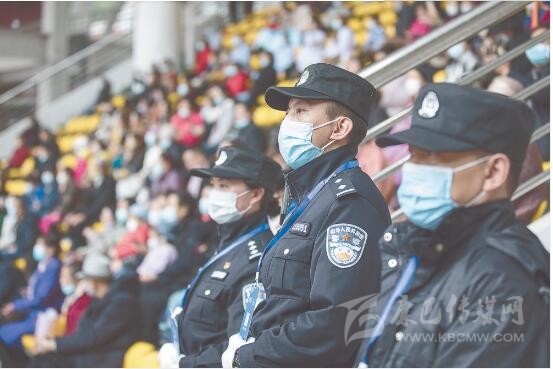 “請出示你的身份證,配戴好口罩?!薄按蟾缒阏义e方向了,你是往那邊走?!薄鞍荩愕奈恢檬峭筮呑??!薄诒遍T體育場,民警除了安保執(zhí)勤以外,還幫助行動不方便的群眾找尋座位,或為咨詢的群眾答疑解惑。