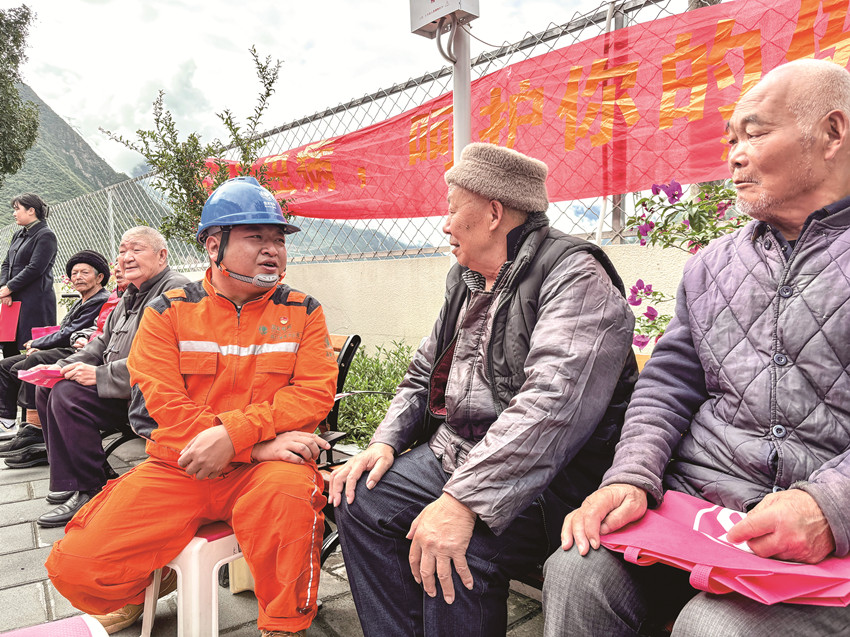 10月11日,國(guó)家電網(wǎng)四川電力甘孜瀘定連心橋共產(chǎn)黨員服務(wù)隊(duì)隊(duì)員陪養(yǎng)老院老人話家常。
