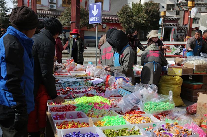 來(lái)自格西鄉(xiāng)的青志巴姆買(mǎi)了一大堆糖果,又到塑料制品攤點(diǎn)與攤主討價(jià)還價(jià),用30元買(mǎi)了一個(gè)糖果盒?!耙酝枪S便放在桌上,既不好看又不衛(wèi)生;現(xiàn)在條件好了,也該講究講究?!彼嬖V記者,農(nóng)村集市貿(mào)易活動(dòng)辦得好,商品集中,家里的年貨在集市里就辦齊了。