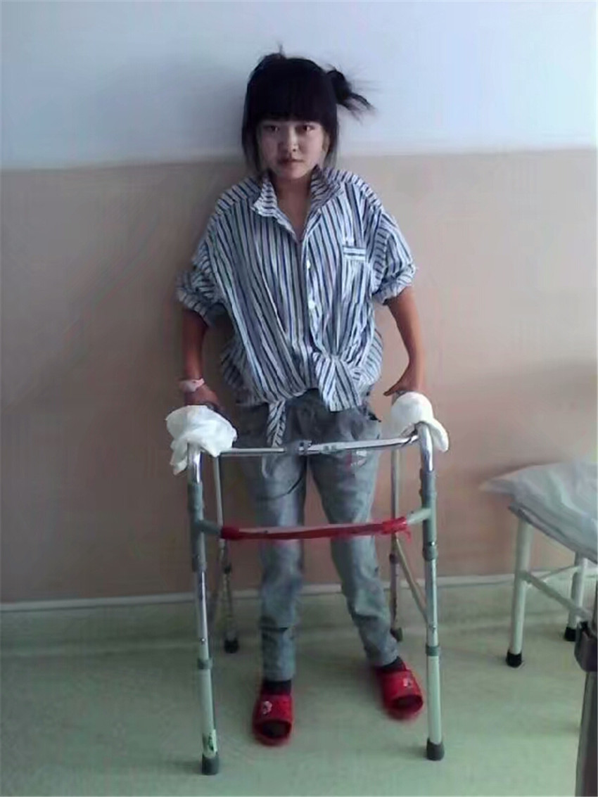 23歲時(shí),深圳的楊先生爽快地幫助朱靈湊夠了手術(shù)費(fèi)用。2013年9月,朱靈在親人的護(hù)送下,到北京接受了手術(shù)治療,手術(shù)很成功。但做牽引、吊腿、揉搓、重壓等康復(fù)訓(xùn)練,如遭酷刑,萬(wàn)般痛苦,她曾想放棄。在病友和親屬的鼓勵(lì)下,她倚墻靠壁,憑借器具,大汗淋漓,通過(guò)一個(gè)多月的康復(fù)鍛煉,朱靈終于站了起來(lái)。