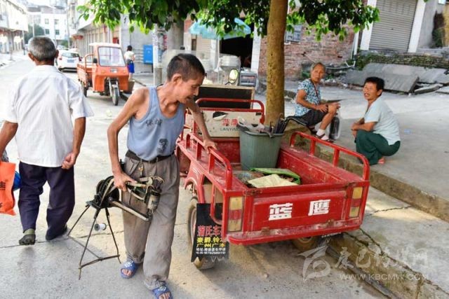 8月15日清晨不到7點(diǎn),在四川省南部縣中心鄉(xiāng)漏米巖村,周強(qiáng)善正將補(bǔ)鞋工具搬上機(jī)動(dòng)三輪車,準(zhǔn)備從家出發(fā)去鄰近的長(zhǎng)坪鎮(zhèn)集市趕場(chǎng)。攝影 張可凡