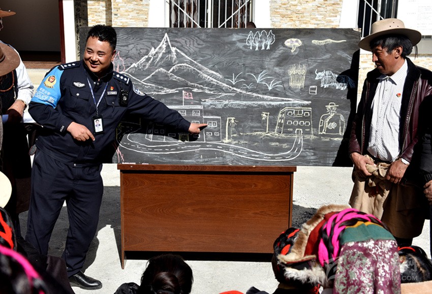 由于轄區(qū)藏族群眾大多都不識漢字、不會漢語,巴桑呷瓦便將自己的繪畫技藝運(yùn)用到普法教育中,2018年10月,康定市公安局在對聯(lián)系鄉(xiāng)甲根壩開展精準(zhǔn)扶貧工作時,在全市范圍內(nèi)抽調(diào)了巴桑呷瓦等10名富有群眾工作經(jīng)驗(yàn)的民警,他一邊負(fù)責(zé)沙德鎮(zhèn)派出所日常工作,一邊負(fù)責(zé)兼職扎日村精準(zhǔn)扶貧工作,用繪畫的方式為牧民群眾描繪脫貧致富夢。他把國家的相關(guān)法律法規(guī)、民族政策和惠民工程政策吃透并制作成故事性強(qiáng)、通俗易通的簡筆畫冊向老百姓解讀、宣講。在巴桑呷瓦妙趣橫生、詼諧幽默的“授課”下,深奧的法律政策變得淺顯易懂。“他的畫形象生動,接地氣,有我們的生產(chǎn)生活場景,我們喜歡看,他的講解幽默風(fēng)趣,我們聽得懂,只要他一下來,村民都圍在他的身邊,舍不得離開?!痹沾宓拇迕褚呀?jīng)把這位“畫家”警察當(dāng)作了自家人。