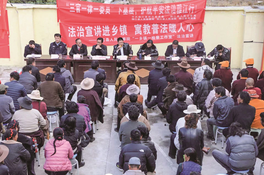 “三官一律一委員”下基層以“五聯(lián)共建”為核心,以政法委員為中心,以雙向報(bào)道、三層處置、三級(jí)監(jiān)督、四區(qū)同治為方法,畫出了適合雅江實(shí)際的“112334”工作流程圖。