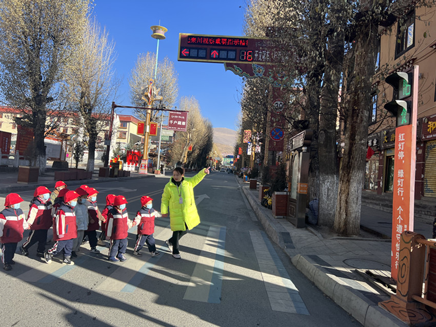 本網(wǎng)訊 理塘縣幼兒園教師非常重視安全教育,讓他們從小養(yǎng)成文明交通出行習慣。圖為11月24日,該園教師正在教幼兒過馬路。