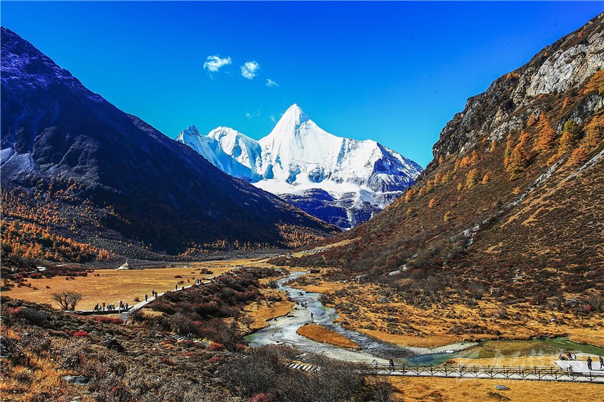 早餐后從稻城出發(fā),翻越海拔4513多米的波瓦山,途徑亞丁村,抵達(dá)目的地亞丁景區(qū)。國(guó)慶節(jié),亞丁景區(qū)迎來(lái)了高峰的人流,排隊(duì)等候景區(qū)大巴車的游客,從大廳排列一直蜿蜒到大門口,經(jīng)過(guò)2小時(shí)漫長(zhǎng)的等待,終于抵達(dá)景區(qū),徒步步行到?jīng)_古寺,景區(qū)里已經(jīng)人滿為患,眼前的亞丁秋色,讓我們忽略了身邊擁擠的人群,只顧欣賞由草地、森林、小溪和嘛呢堆組成的天然沖古草坪。沿著沖古寺仰望仙乃日神山而上,往返約3公里步行約2小時(shí),一步一步來(lái)到美如仙境般的珍珠海;返回山下,繼續(xù)乘坐景區(qū)電瓶車到達(dá)洛絨牛場(chǎng),返程順溪流而下。當(dāng)天入住香格里拉鎮(zhèn)日松貢布酒店。
