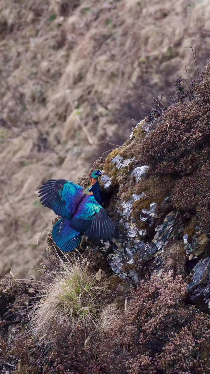 據(jù)了解,綠尾虹雉屬雞形目雉科,羽毛多彩絢麗,有著“蜀山彩虹”的美譽(yù)。綠尾虹雉以植物的嫩葉、花蕾、嫩枝、幼芽和種子等為食,它們棲息于海拔3000米至5000米的針葉林、高山草甸、灌叢和裸巖地帶,每年4-5月繁殖。是我國(guó)的特產(chǎn)種類(lèi),分布于四川、云南西北部、西藏東南部、甘肅東南部和青海南部一帶,珍稀程度堪比大熊貓。